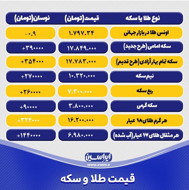 آخرین قیمت سکه و طلا برای امروز ۱۹ آذر ماه سال ۱۴۰۱ اعلام شد که بر اساس آن قیمت سکه امامی به ۱۷ میلیون و ۸۴۹هزار تومان رسید.