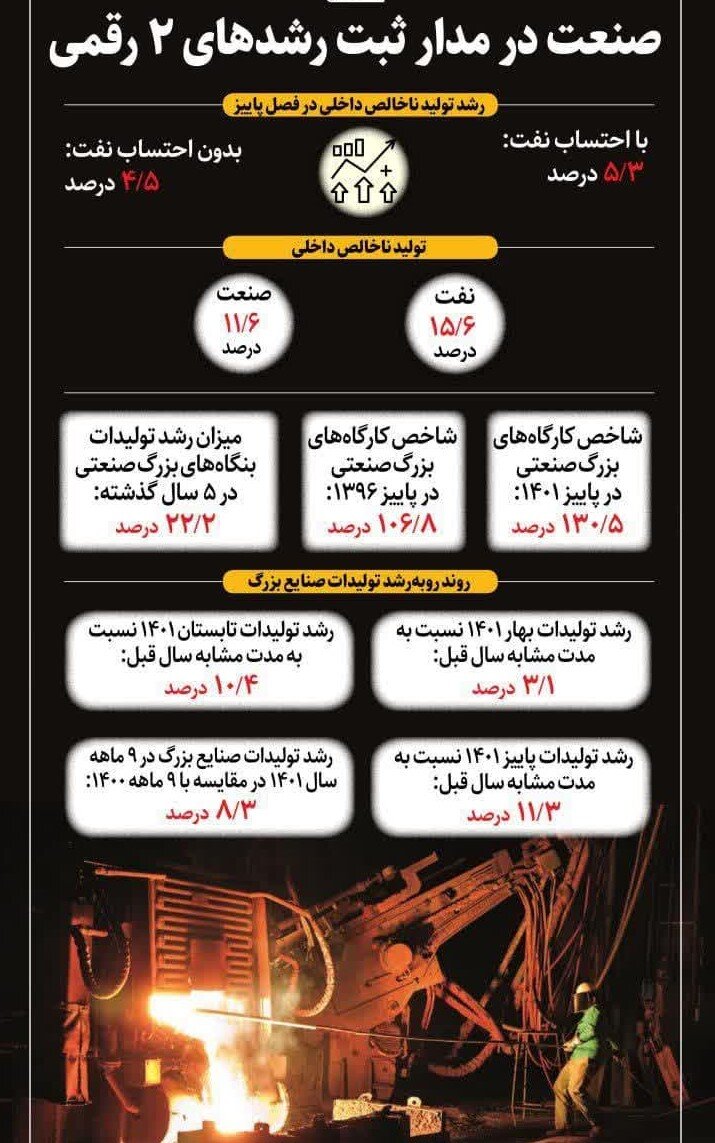 تولید ناخالص داخلی شامل ۴ بخش نفت، کشاورزی، صنعت و خدمات می شود و در بین این چهار بخش، رتبه نخست رشد تولید به بخش نفت با ۱۵.۶ درصد و رتبه دوم به بخش صنعت با ۱۱.۶ درصد اختصاص دارد. رشد ۱۱.۶ درصدی بخش صنعت در پاییز ۱۴۰۱ بالاترین رقم از ابتدای سال ۱۳۹۶ به بعد محسوب میشود زیرا از ابتدای سال ۱۳۹۶ یعنی یک سال قبل از بازگشت تحریمها در دولت قبل، رشد فصلی بخش صنعت نزولی شده بود.