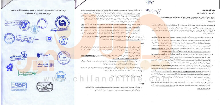 نظر به مصوبه اخیر هیئت وزیران در خصوص افزایش صددرصدی نرخ گاز صنعت فولاد، ضمن جلب نظر حضرتعالی به موارد زیر و اعلام خطر جدی نسبت به توقف سرمایهگذاریها در صنعت فولاد، درخواست بازنگری در این مصوبه با مهر و امضای شرکتهای پیوست که بیش از ۸۰ درصد فولاد کشور را تولید و بیش از ۶ میلیارد دلار از ارز مورد نیاز کشور را تأمین مینمایند، جهت صدور دستورات لازم به حضورتان ارائه میگردد: