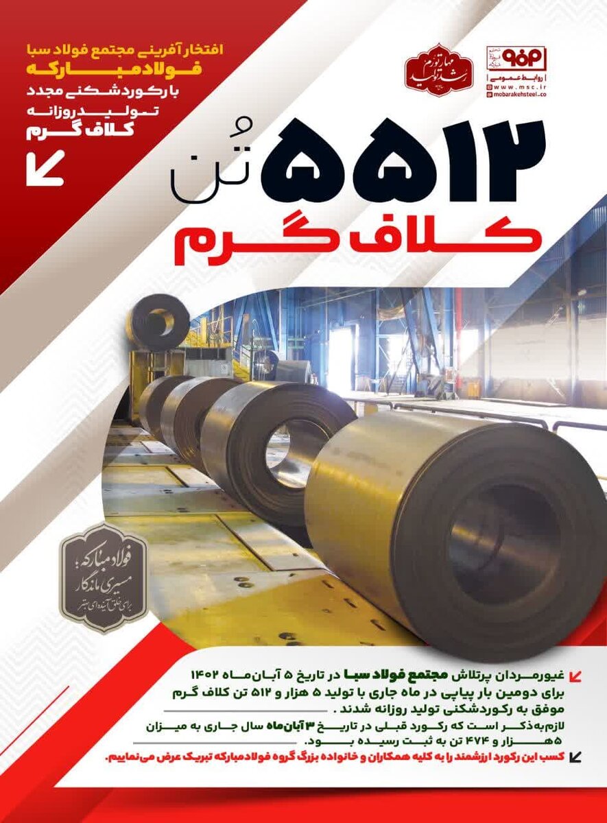 به گزارش ایراسین، کارکنان مجتمع فولاد سبا شرکت فولاد مبارکه در روز پنجم آبانماه تولید ۵ هزار و ۵۱۲ تن کلاف کلاف گرم موفق به شکستن رکورد تولید روزانه شدند.
