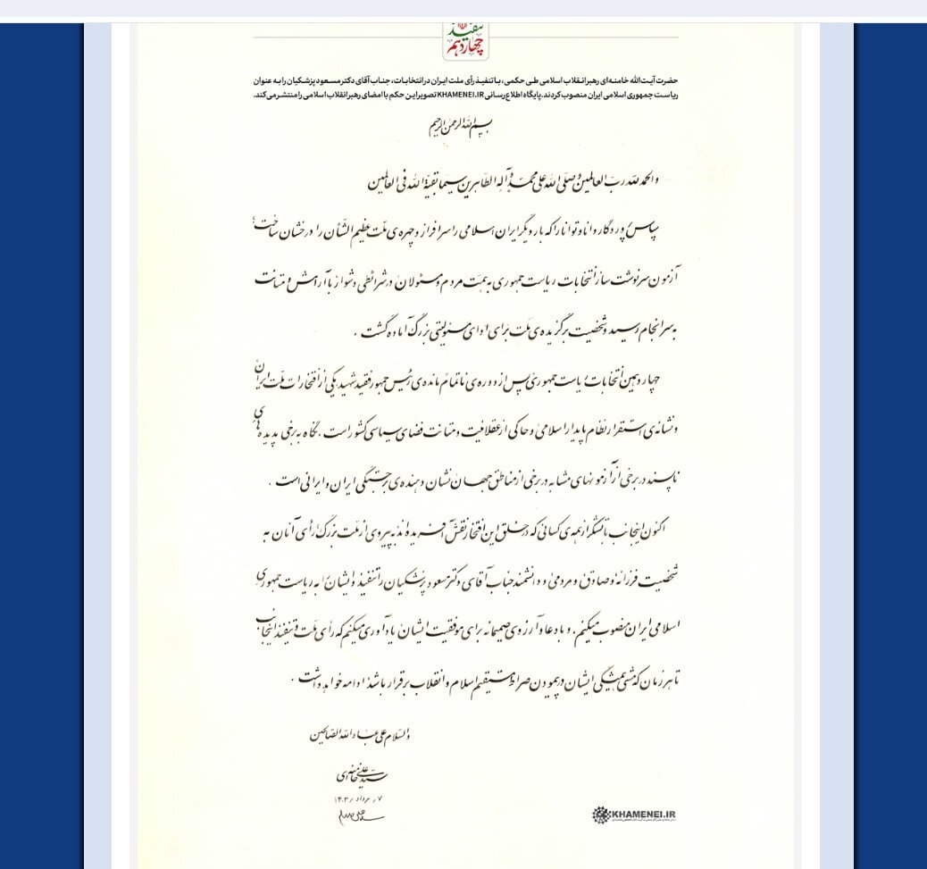اکنون اینجانب با تشکر از همهی کسانی که در خلق این افتخار نقش آفریدهاند، به پیروی از ملت بزرگ، رأی آنان به شخصیت فرزانه، و صادق، و مردمی، و دانشمند جناب آقای دکتر مسعود پزشکیان را تنفیذ و ایشان را به ریاست جمهوری اسلامی ایران منصوب میکنم. و با دعا و آرزوی صمیمانه برای موفقیت ایشان، یادآوری میکنم که رأی ملت و تنفیذ اینجانب تا هر زمان که مشی همیشگی ایشان در پیمودن صراط مستقیم اسلام و انقلاب برقرار باشد، ادامه خواهد داشت. والسلام علی عبادالله الصالحین سید علی خامنهای ۷/مرداد/۱۴۰۳
