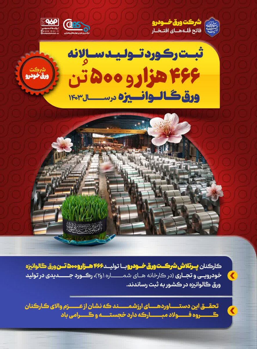 شرکت ورق خودرو با تولید ۴۶۶ هزار و ۵۰۰ تن ورق گالوانیزه خودرویی و تجاری (در کارخانههای شماره ۱و۲)، رکورد جدیدی در تولید ورق گالوانیزه در کشور به ثبت رساندند.
