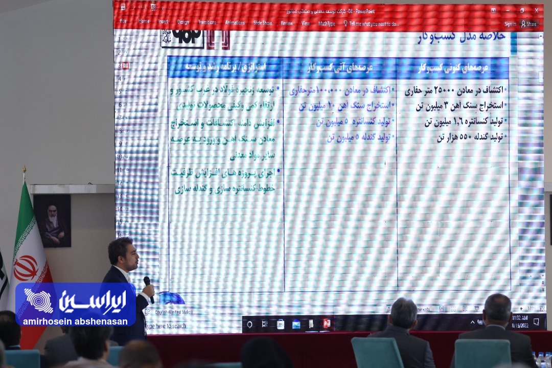روز پایانی کارگاه دو روزه طراحی مدل کسبوکار شرکت سرمایهگذاری توسعه معادن و فلزات در روز دوشنبه ۲۴ مردادماه ۱۴۰۱ با حضور مدیرعامل شرکت فولاد مبارکه و مدیرعامل سرمایهگذاری توسعه معادن و فلزات برگزار شد. در روز دوم کارگاه، مدلهای کسبوکار طراحی شده توسط مدیرانعامل شرکتهای زیر مجموعه بررسی و ارائه شد. (عکاس: امیرحسین آبشناسان)