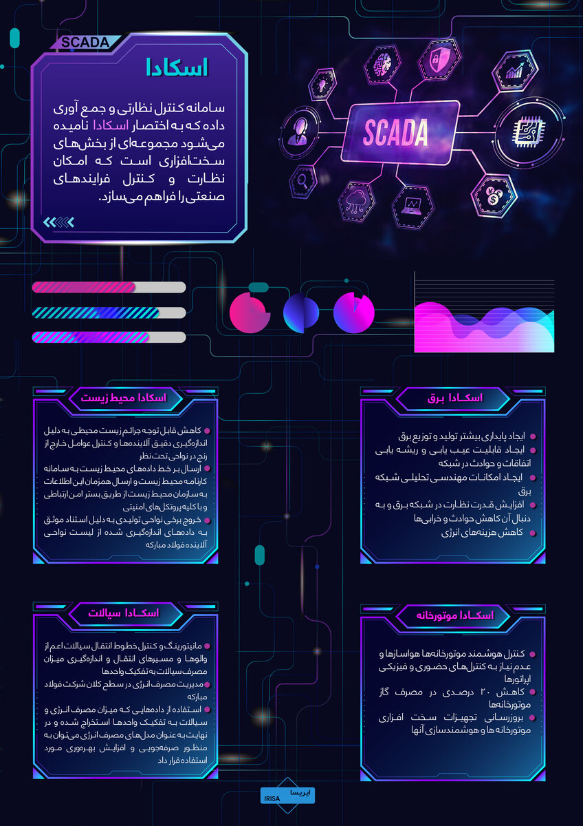 شرکت فولاد مبارکه به همت شرکت ایریسا توانست ۴ پروژه اسکادا در حوزه برق، موتورخانه، محیط زیست و سیالات به بهرهبرداری برساند. ایریسا اسکادا یک سیستم کنترل نظارتی و جمعآوری دادهها (SCADA) ایرانی است که برای اتوماسیون فرآیندهای صنعتی در صنایع مختلف مانند نفت و گاز، آب و فاضلاب، برق، فولاد، و سیمان کاربرد دارد.
