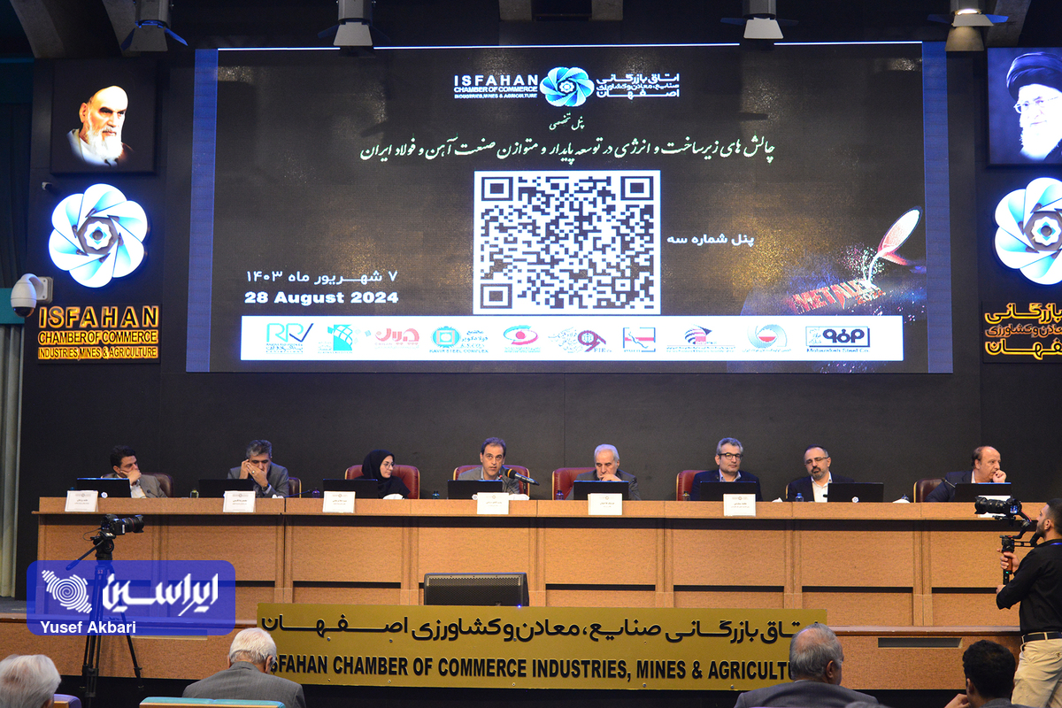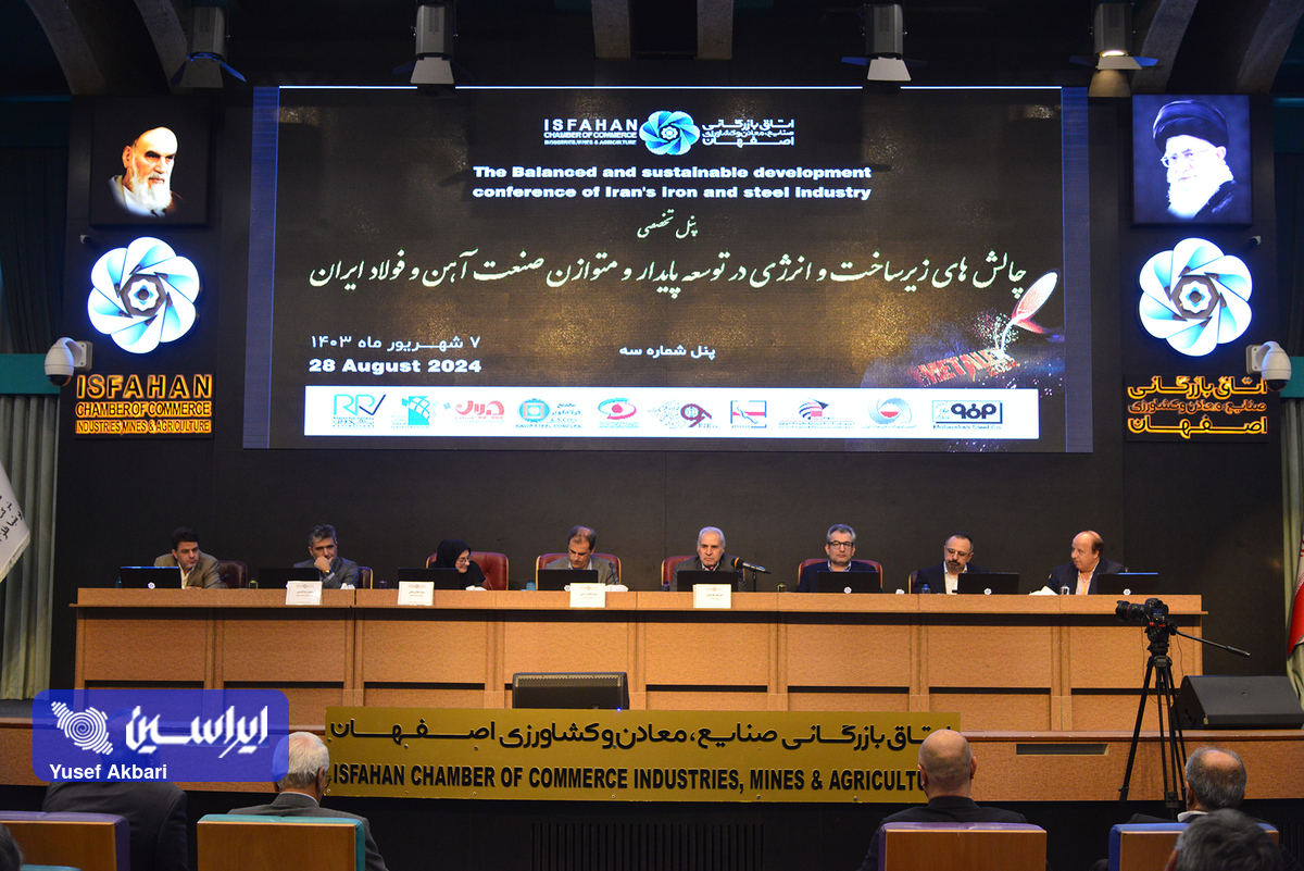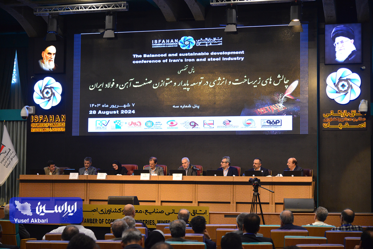 همایش «توسعه متوازن و پایدار صنعت آهن و فولاد ایران» چهارشنبه ۷ شهریورماه ۱۴۰۳ در اتاق بازرگانی، صنایع، معادن و کشاورزی اصفهان با چهار پنل تخصصی برگزار شد. سومین پنل تخصصی این رویداد «چالشهای زیرساخت و انرژی در توسعه پایدار و متوازن صنعت آهن و فولاد ایران» بود.(عکاس: یوسف اکبری)